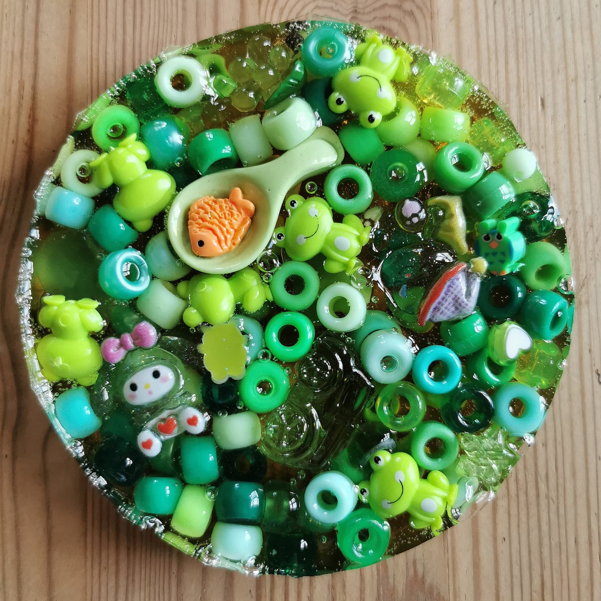 Biohajoavasta ComposiMold-massasta valmistettu hermohali tuo helpotusta nyppimishimoon! Sisältää ison määrän erilaisia hauskoja akryyli- ja muovihelmiä ja pikku esineitä. Halkaisija 10 cm, paksuus n 2 cm. HUOM! Tuote EI ole lelu, eikä ole tarkoitettu lasten käyttöön. Sisältää pieniä osia!