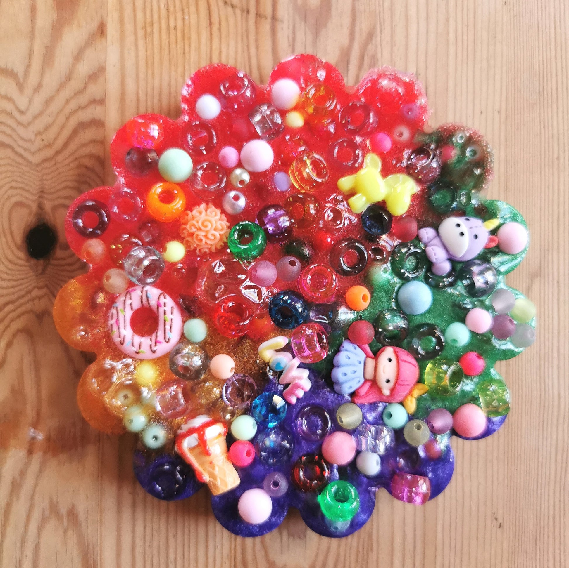Biohajoavasta ComposiMold-massasta valmistettu hermohali tuo helpotusta nyppimishimoon! Sisältää ison määrän erilaisia hauskoja akryyli- ja muovihelmiä ja pikku esineitä. Halkaisija 12 cm, paksuus n 1 cm. HUOM! Tuote EI ole lelu, eikä ole tarkoitettu lasten käyttöön. Sisältää pieniä osia!