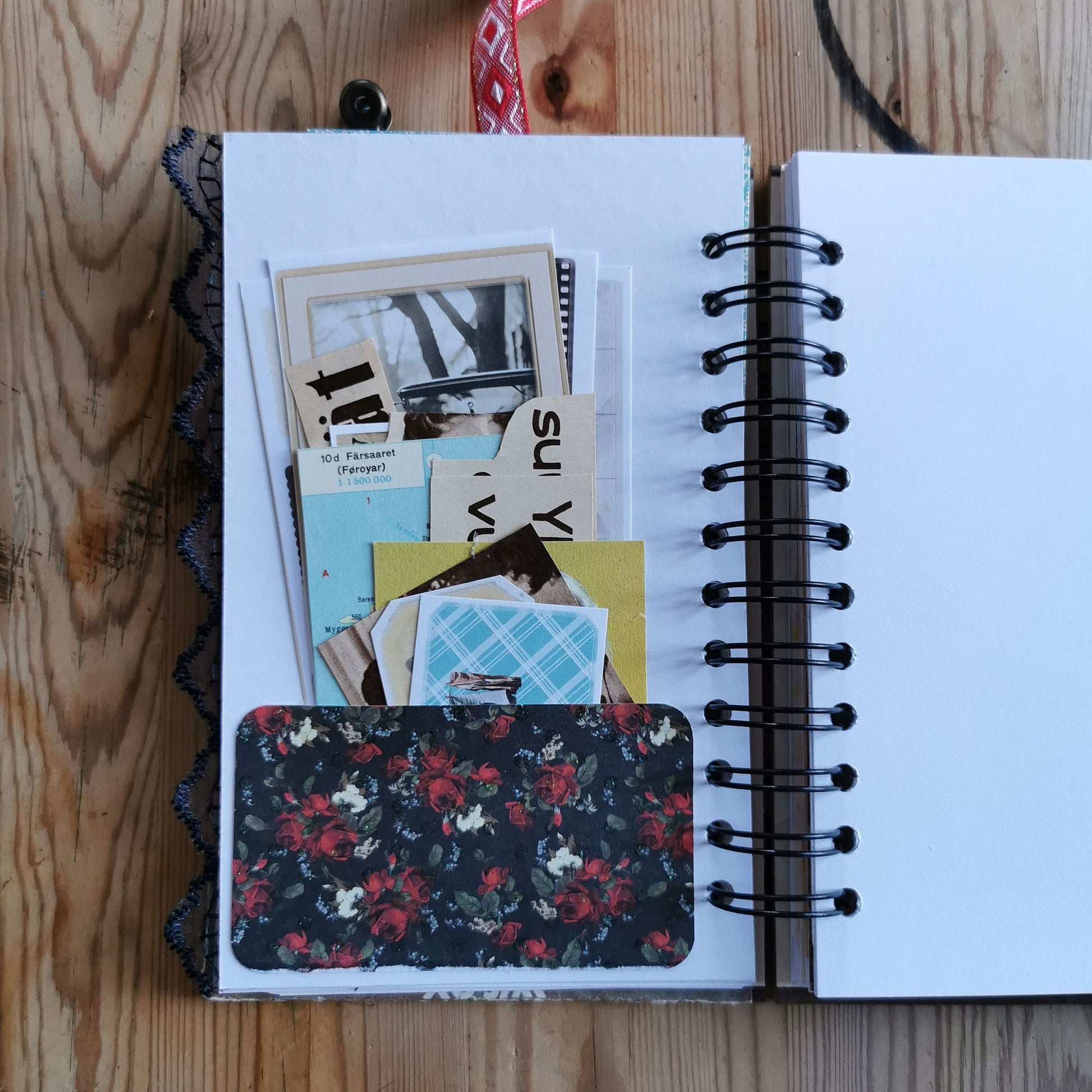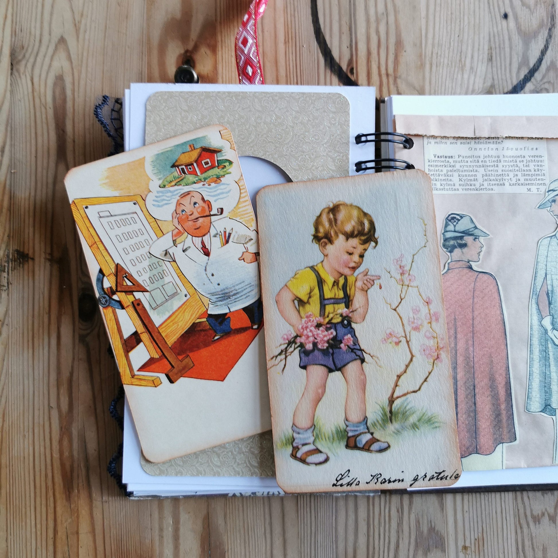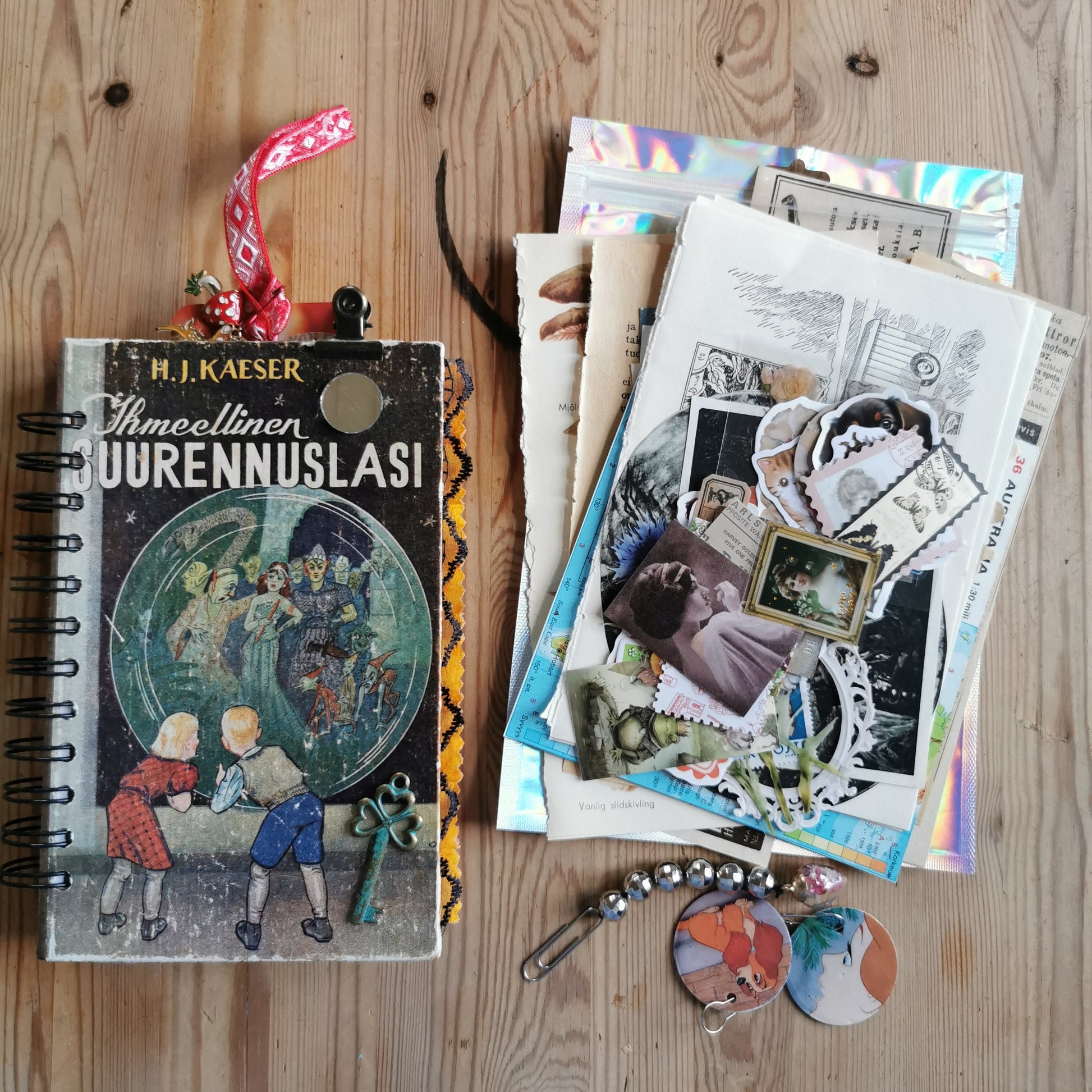 Ikivanhan lastenkirjan kannet pääsivät muistikirjan kansiksi Halikaupan uudessa Whimsical-sarjassa, jossa valkoisten sivujen seasta voi löytää kaikkea hassua :) Yksi kalenterikoru, kaksi tägiä, kirjanmerkki, yllätyssivuja, paljon tarroja, sekä "ephemera"-nipullinen, eli vanhoja kirjansivuja, nuottisivu, karttasivu, mainoksia (vanhimmat v 1898!) jne jne eli kaikenlaista mitä skräppääjä tai muu muistikirja-askartelija voisi himoita :) Valkoisia tai muita kirjoitukseen kelpaavia sivuja on tässä n 40. Tee tästä runokirja, haavekirja, ihan vaan muistikirja oppitunneille tai kokouksiin - keksi itse lisää käyttötarkoituksia!