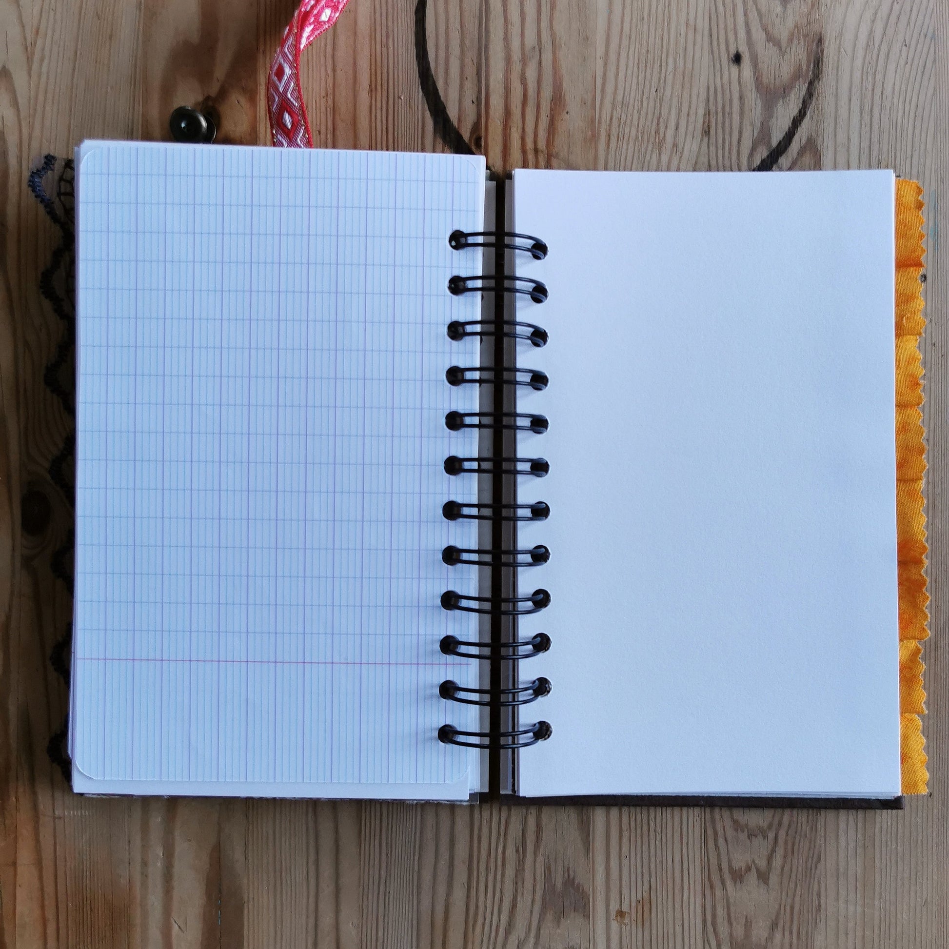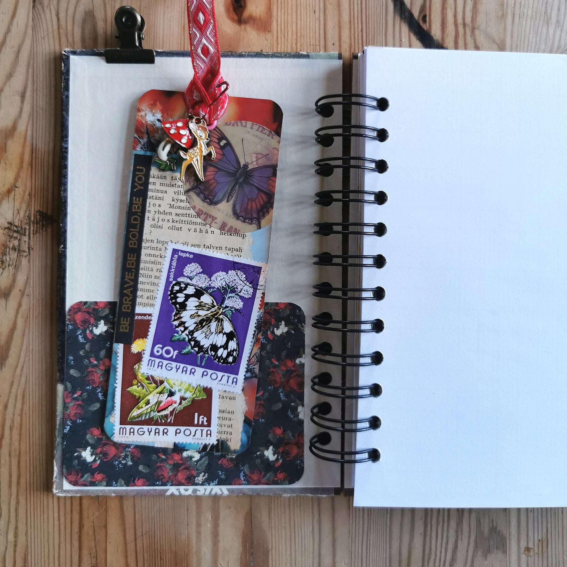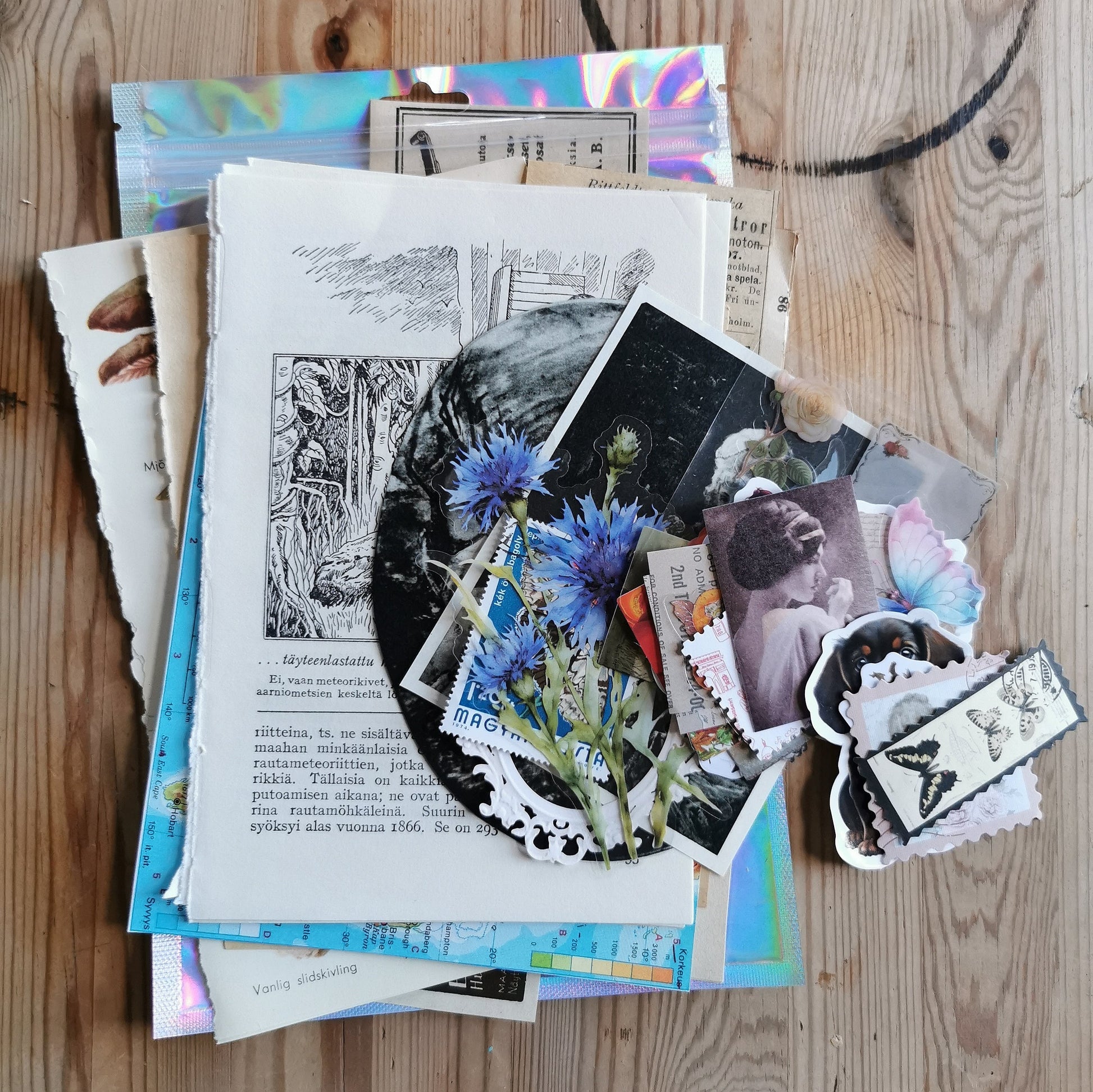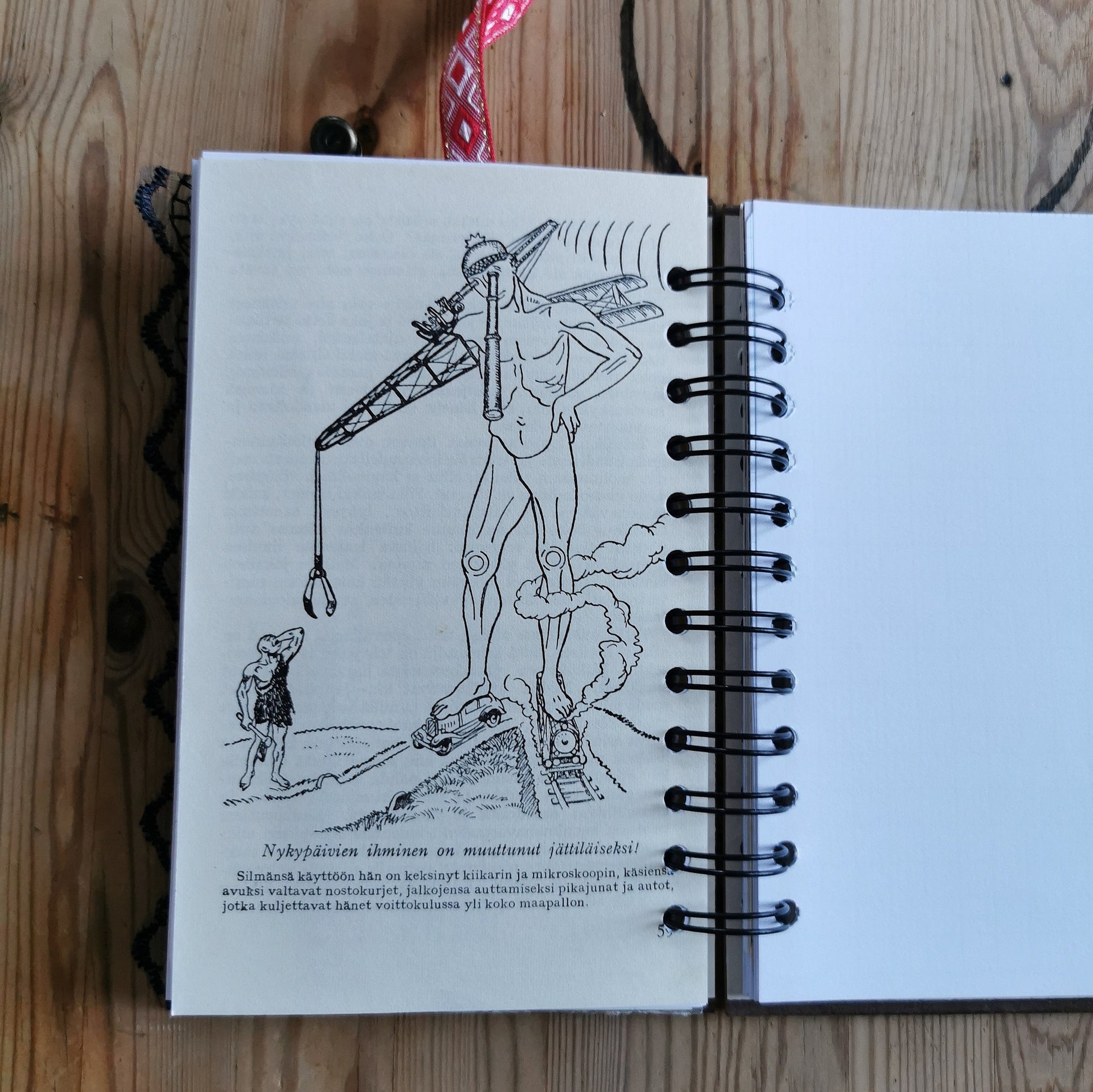 Ikivanhan lastenkirjan kannet pääsivät muistikirjan kansiksi Halikaupan uudessa Whimsical-sarjassa, jossa valkoisten sivujen seasta voi löytää kaikkea hassua :) Yksi kalenterikoru, kaksi tägiä, kirjanmerkki, yllätyssivuja, paljon tarroja, sekä "ephemera"-nipullinen, eli vanhoja kirjansivuja, nuottisivu, karttasivu, mainoksia (vanhimmat v 1898!) jne jne eli kaikenlaista mitä skräppääjä tai muu muistikirja-askartelija voisi himoita :) Valkoisia tai muita kirjoitukseen kelpaavia sivuja on tässä n 40. Tee tästä runokirja, haavekirja, ihan vaan muistikirja oppitunneille tai kokouksiin - keksi itse lisää käyttötarkoituksia!